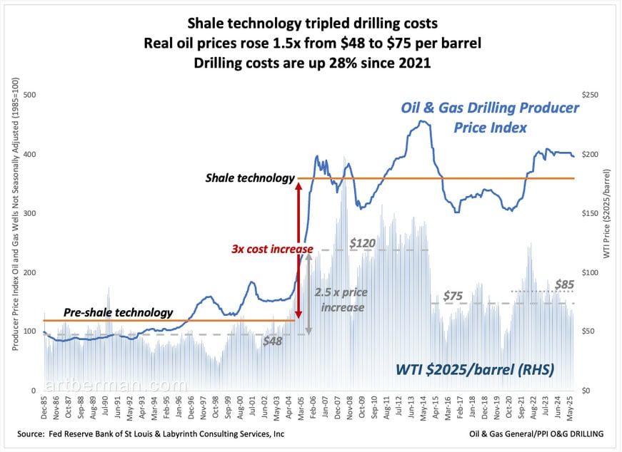As Figure 2 shows, even after the price collapse, oil never returned to its pre-shale level in real terms. The real WTI price is about 1.5 times higher—$75 versus $48 before shale. Over the same period, drilling costs roughly tripled and have risen 28% just since Covid. The average WTI price since 2021 is $85, and even today’s supposedly “cheap” $59 oil is still about 25% higher than the pre-2006 average.