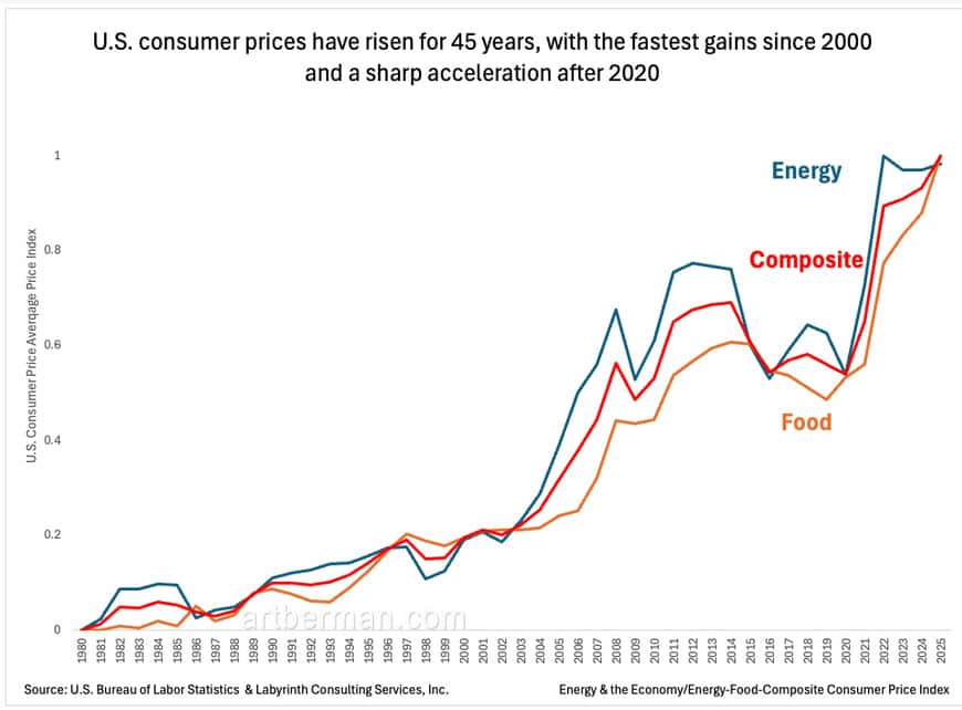 These higher energy costs have made everything more expensive. U.S. consumer prices have risen for 45 years, with the steepest increases since 2000 and a sharp acceleration after 2020 (Figure 3). That goes a long way toward explaining why so many people feel desperate and angry, and why they are drawn to populist movements that promise to fix things. But those movements can’t change the underlying energy reality with different positions on immigration, taxes, tariffs or interest rates. They are offering policy answers to a biophysical problem.